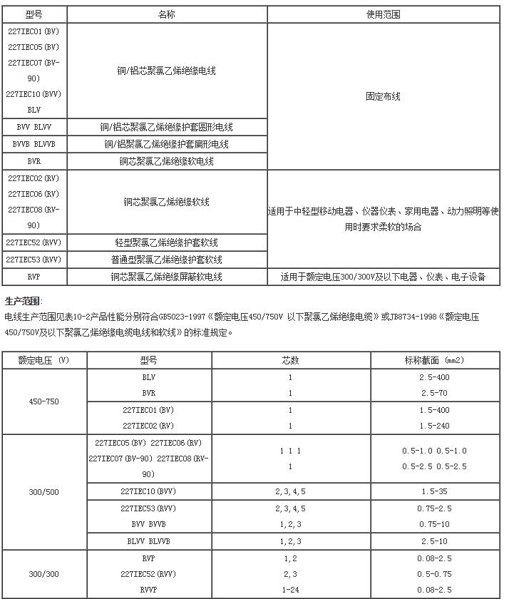 本產(chǎn)品適用于交流額定電壓450/750V及以下的家用電器、小型電動(dòng)工具、儀器儀表及動(dòng)力照明裝置電源連接,其型號(hào)、名稱及使用范圍見表。電線的工作溫度除BV—90、RV—90為90℃外,其余均為700℃。